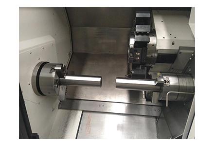 2)主軸箱及副主軸箱采用電主軸結構,主軸轉(zhuǎn)速高,剛性好,動態(tài)響應快,提高了加工圓度和表面的精度。對列式雙電主軸結構可在高速旋轉(zhuǎn)的情況下進行工件交換,配合12工位伺服刀架,可實現(xiàn)對工件的全部或大部分工序的加工,很大程度上節(jié)省了裝夾和加工時間,提高了加工效率。雙C軸功能可在任一主軸上進行工件分度和曲面插補加工。